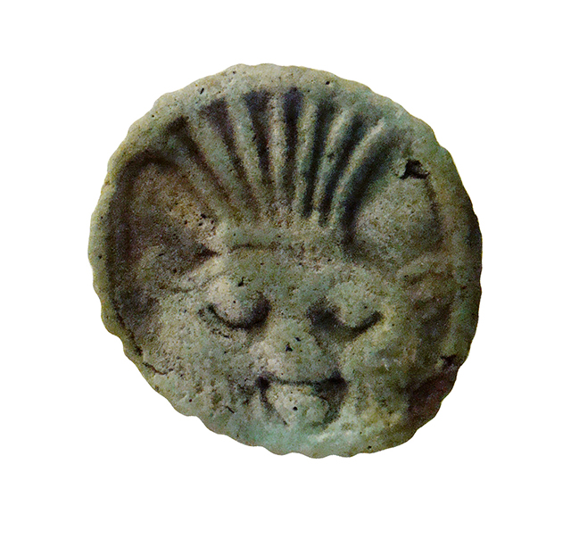 Piastrina circolare in faience, con bordo seghettato e foro passante, con funzione di amuleto. Raffigura su una faccia il volto della divinità apotropaica Bes, frontale con le orecchie sporgenti, le sopracciglia evidenziate, la barba e il grande naso piatto. Sul capo porta una corona di piume di struzzo. Sulla faccia opposta vi è l'immagine di un occhio udjat.