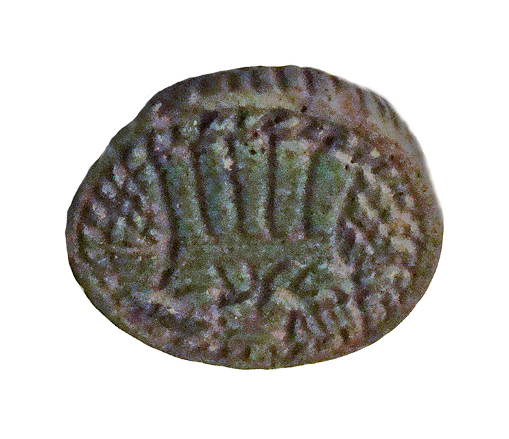 Piastrina circolare in faience, con bordo seghettato e foro passante, con funzione di amuleto. Raffigura, all’interno di una cornice con motivo a corda, su una faccia il volto della divinità apotropaica Bes, frontale con le orecchie sporgenti, le sopracciglia evidenziate, la barba e il grande naso piatto. Sul capo porta una corona di piume di struzzo. Sulla faccia opposta, sempre all’interno di una cornice uguale all’altra, vi è l'immagine di un occhio udjat.