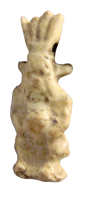 Amuleto in faience raffigurante la divinità apotropaica Bes. Il dio è raffigurato nel suo aspetto consueto: con il corpo tozzo e le gambe arcuate, le braccia appoggiate sulle cosce, il volto frontale con le orecchie sporgenti, le sopracciglia evidenziate, la barba e il grande naso piatto. Sul capo porta una corona di piume di struzzo, attraverso la quale vi è un foro passante.