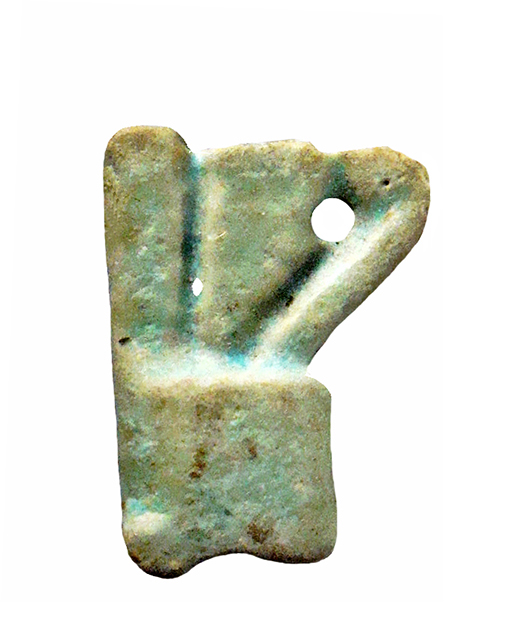 Amuleto in faience lavorato a rilievo, con foro passante nella parte superiore. Raffigura la corona rossa del Basso Egitto, simbolo di autorità nell'oltretomba (come quella che il faraone aveva in vita).