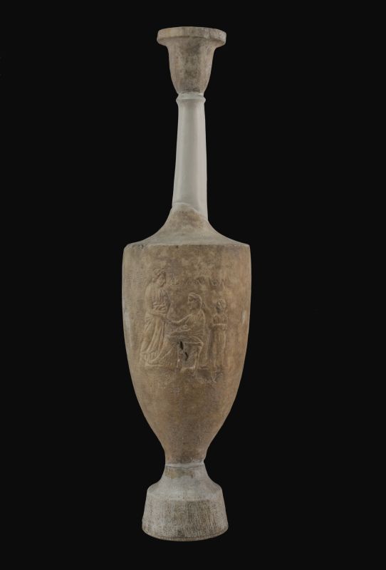 Lekythos di cui rimane una porzione centrale con rilievo, mutilo del piede e del collo. Lo specchio, non definito, mostra un uomo stante con un manto che gli copre le spalle; tende la mano a una donna seduta su un sedile con schienale e gambe arcuate. Ella indossa chitone e himation che le copre la spalla e il braccio di sinistra, la schiena e la parte inferiore del corpo. Alle sue spalle si trova una figura di inserviente che indossa un peplo in atto di sorreggere un oggetto con il braccio destro, mentre il sinistro è steso lungo il fianco. La scritta in lettere greche, poco leggibili, inizia poco sopra la testa dell’uomo.