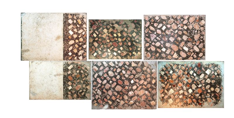Sei pannelli del mosaico della prima fase edilizia appartenuto all’ambiente G, aperto sul portico del giardino, aveva questo pavimento mosaicato a tessere bianche con al centro una stretta fascia a tessellato nero con fitti inserti di marmi venati e ciottoli fluviali bianchi e rossi screziati, disposti irregolarmente. In questa stanza fu rinvenuta la statua marmorea dell’atleta detto Palestrita (inv.2238).