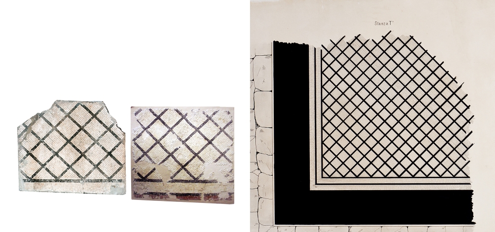 Due pannelli del mosaico della seconda fase edilizia appartenuto all’ambiente T’, munito di un’alcova in muratura, ove erano i letti, e di un sedile, che si trovava tra il portico panoramico e l’esedra, e aveva questo pavimento a mosaico con disegno a reticolato di quadrati disposti in diagonale, nero su fondo bianco; cornice a fascia bianca tra linee nere.