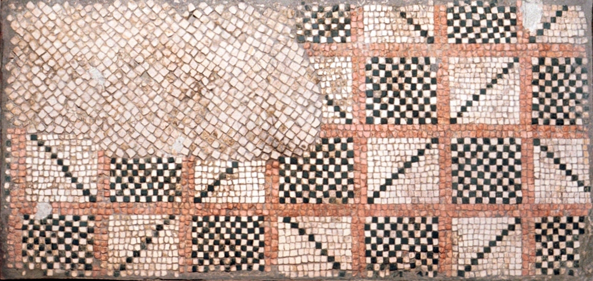 Un pannello del mosaico della Prima fase edilizia, dall’ambiente di rappresentanza, che aveva verso il giardino una soglia con questo mosaico dal disegno a scacchiera, delimitata da reticolato rosso su fondo bianco; i quadrati che ne risultano sono, a loro volta, resi alternativamente a scacchiera o con diagonali nere. Il mosaico presenta vistose tracce di sommario restauro antico.