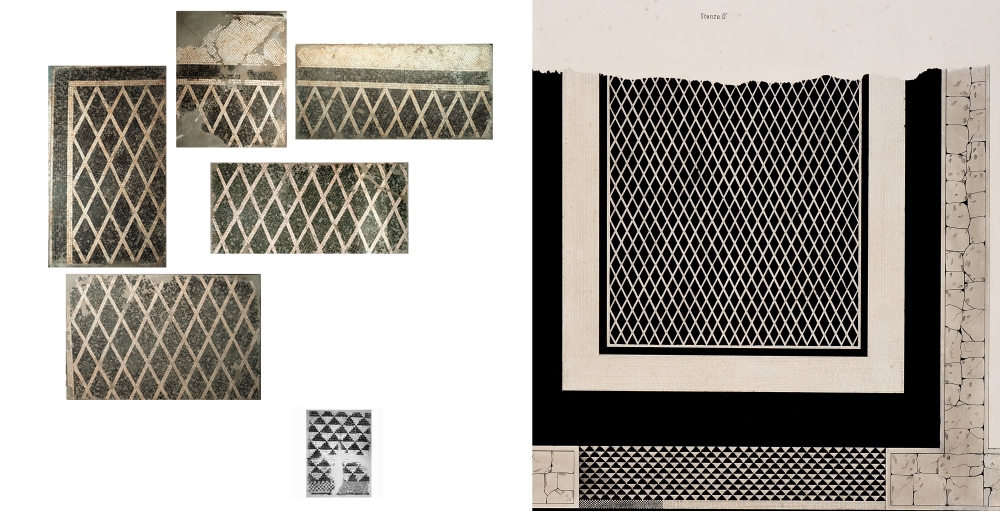 Due pannelli della prima fase edilizia appartenuti alla soglia della porta verso il portico panoramico del cubicolo (stanza da letto) O presentava questo mosaico a disegno di triangoli a scala neri su fondo bianco distribuiti a scacchiere e aveva fascia esterna bianca rappezzata a tessere nere.