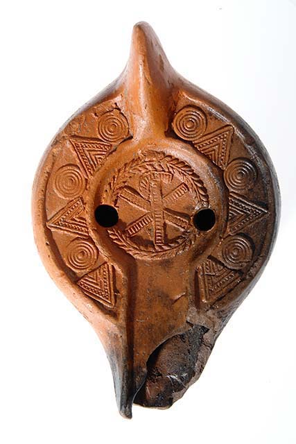 Lucerna africana. Mancante dell'estremità del becco. Nel campo i due «infundibula» sono spostati all'orlo; tra essi «chrismon» riempito da segmenti, con l'occhiello della «rho» a sinistra, in medaglione formato da corona di alloro. Sull'orlo sei decorazioni geometriche per parte: triangoli gemmati e patere alternati. Ansa piena puntuta. Sottofondo piatto con piedino circolare al cui centro due circonferenze concentriche, incise. Realizzata in argilla e vernice rossa con lavorazione in stampo doppio.