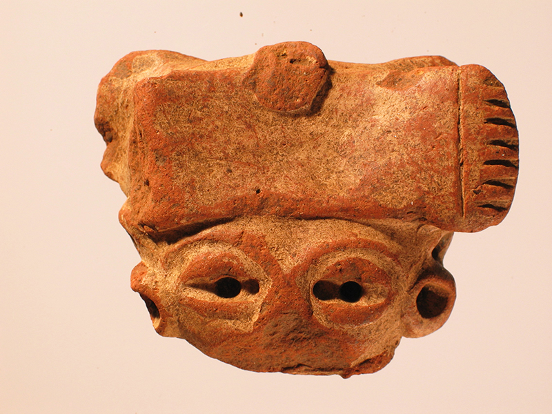 Sonaglio di stile Usulután in argilla piena raffigurante una testa umana con copricapo. L’impasto di argilla rossa, modellato a mano, è stato ricoperto da un bagno di argilla bianca molto fine (ingobbio) le cui tracce sono ben evidenti sia sul viso che sul copricapo. Il volto è gravemente danneggiato, manca tutta la parte inferiore del viso, mento bocca e parte terminale del naso. Spiccano le arcate sopracciliari ben disegnate e in rilievo. Gli occhi sono resi dalla consueta fessura con perforazione centrale e palpebre in rilievo. Ai lati del viso emergono le orejeras circolari con un profondo incavo al centro, forse atto ad ospitare un altro materiale decorativo. Il copricapo è composto da due ampi rettangoli paralleli posti uno sulla fronte e l’altro dietro la testa. I bordi terminano con delle frange che probabilmente rappresentano piume di uccello. Al centro infatti si affacciava una testina in rilievo, molto probabilmente ornitomorfa. Le sgargianti piume di pappagallo e di altri uccelli tropicali, usate per confezionare copricapi, mantelli e pettorali per l’alta gerarchia sociale, furono oggetto di importanti scambi commerciali tra America centrale e Mesoamerica. Ai due lati del viso, immediatamente sopra i lobi, si osserva un foro che trapassa la figura da parte a parte.