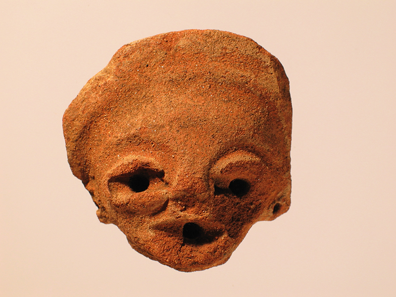 Piccola testina fittile di stile Usulután che rappresenta un volto umano. Le parti del viso che erano in rilievo, occhi, naso e bocca, si sono spezzati. Ancora ben evidenti sono il foro al centro delle labbra e quello che rendeva l’iride. I lobi sono appena accennati e dotati di orecchini forati al centro. La testa si assottiglia e si allarga verso l’alto, fino a confondersi con la fascia arcuata del copricapo. La patina superficiale è quasi totalmente abrasa, ma la pittura bianca che ricopriva la figura è ancora visibile in tracce.