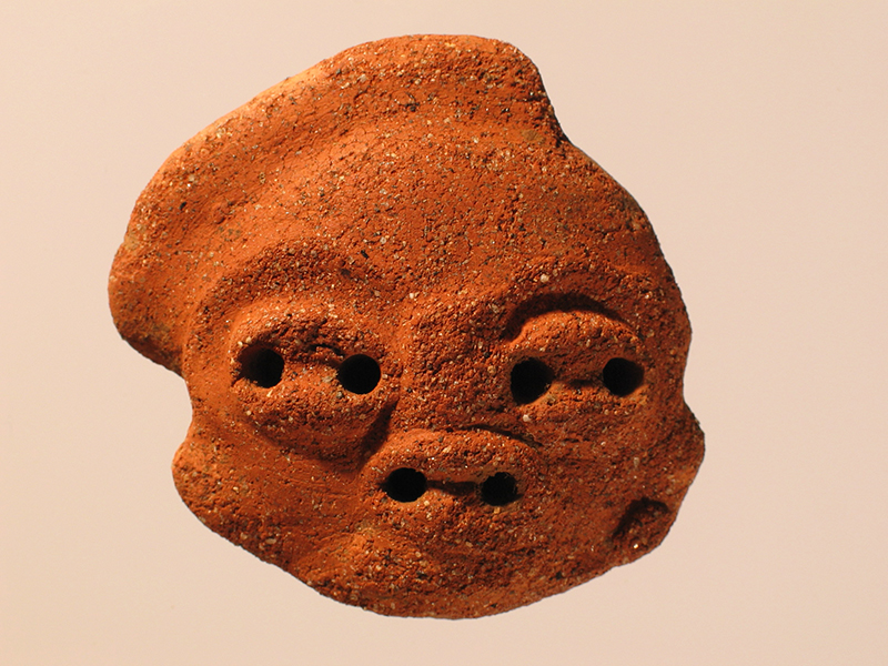 Piccolo volto umano di stile Usulután in terracotta rossa realizzato in modo stilizzato. Gran parte della superficie conserva ancora l’ingobbiatura marrone che la ricopriva interamente. La testina è piatta su entrambi i lati. Sulla parte frontale sono rappresentati gli occhi e la bocca, resi mediante alcuni fori disposti a coppie. Il naso è spezzato. Ai due lati del viso si notano due leggere sporgenze, le orecchie. In alto è rappresentato il copricapo a forma di mezzaluna che riproduce forse il tipico turbante.