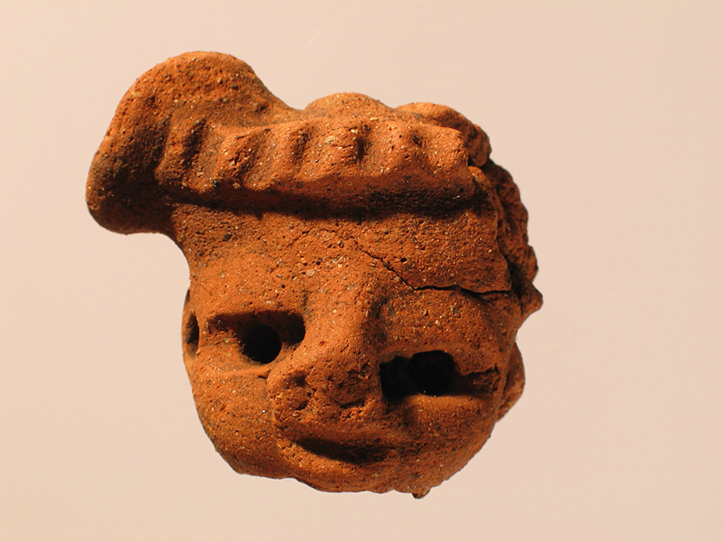 Rappresentazione plastica di stile Usulután di un volto, probabilmente femminile, modellato in terracotta. I tratti somatici sono pesanti, approssimativi e poco realistici nelle proporzioni. Con maggiore cura è reso il copricapo. Si tratta di una complessa acconciatura definita da un cordone frontale scanalato, e da un elemento discoidale posto in diagonale su un lato. Dietro, sulla nuca, scendono tre liste di capelli in rilievo. Simili acconciature, realizzate con fasce di tessuto avvolte o intrecciate, sono ancora oggi in uso in Centro America. La parte destra della figura è stata gravemente danneggiata.
