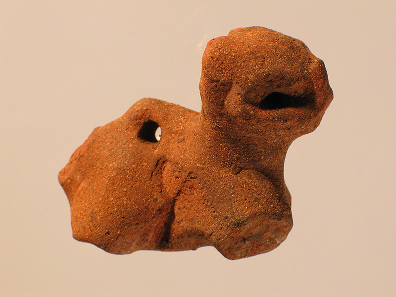 Animaletto di stile Usulután modellato in terracotta, forse con funzione di amuleto. Si tratta di un felino, probabilmente un giaguaro. Il corpo dell’animale è privo delle zampe che si sono spezzate. La testa è rotonda con piccole orecchie semicircolari. Il muso mostra delle scanalature ai lati: qui sono praticati i fori degli occhi. Sulla schiena è visibile una presina ad anello che serviva forse per appendere la figurina. La superficie non è stata ingobbiata, si presenta ruvida e annerita in alcune zone. Manca la parte posteriore sinistra del corpo.