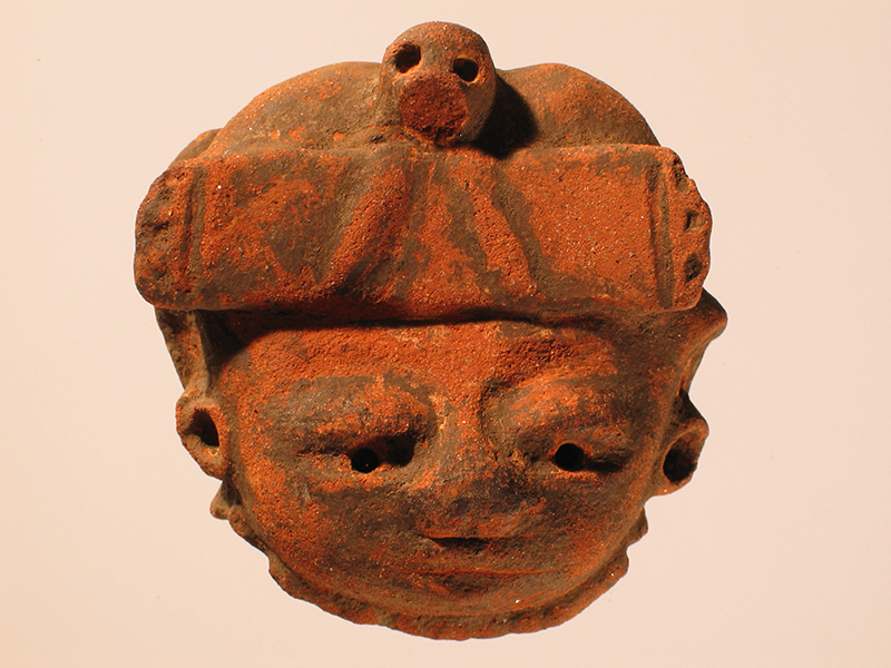 Testa antropomorfa di stile Usulután di argilla rossa con interno cavo. Era rivestita da ingobbiatura crema, oggi presente solo in minime tracce. Il collo è pieno mentre all’interno è presente un nucleo mobile che rivela l’uso della figurina come sonaglio. A tale scopo è stato praticato il foro visibile sopra l’orecchio sinistro. Il volto presenta un accentuato prognatismo mentre la fronte è appiattita e si incurva leggermente all’indietro. Su questa è applicata una placca rettangolare al centro della quale si notano due cordoni diagonali. In alto al centro emerge una testa di uccello con il becco spezzato.