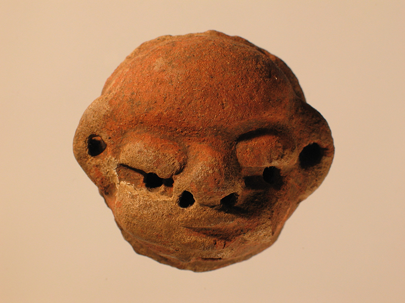 Applique sonaglio a forma di testa antropomorfa, di stile Usulután. Lavorata con argilla rossa e ingobbiata in color crema. L’interno è cavo e contiene pezzetti di terracotta o pietruzze. Era applicata alla parete di un vaso del quale resta un frammento nella parte posteriore. Il volto è rotondo con ampia fronte liscia. Gli occhi hanno le palpebre in rilievo e un foro al posto dell’iride. Il naso è piccolo ma segnato da narici forate. La bocca è appena individuata con un tratto orizzontale. Sotto al mento è visibile un altro foro comunicante con l’interno. Le orecchie semicircolari hanno un foro passante.