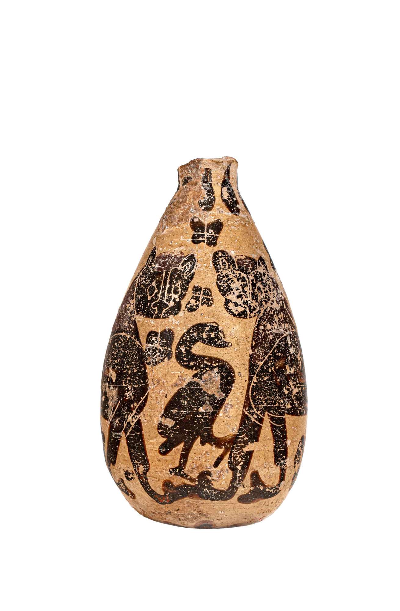 Alabastron piriforme con due pantere affrontate e in mezzo cigno ad ali abbassate; nel campo rosette con ritocchi di colore rosso.