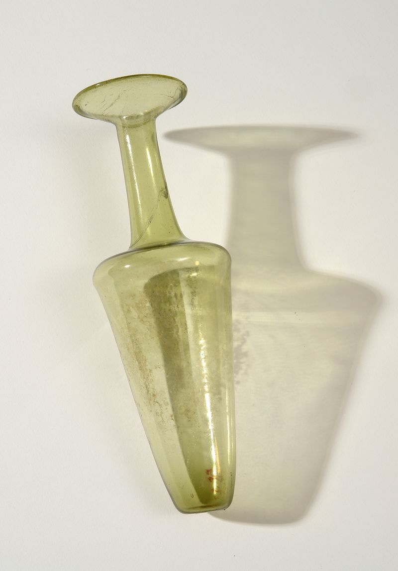 Realizzata in vetro sottile verdastro, trasparente, presenta poche bolle piccole. Orlo estroflesso, labbro ingrossato e arrotondato, collo cilindrico, spalla marcata e arrotondata, ventre troncoconico, fondo leggermente concavo.