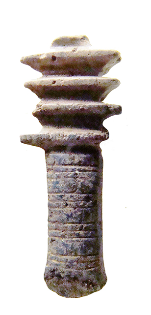 Amuleto in pietra, con foro passante, che raffigura il geroglifico "djed", a forma di pilastro con quattro espansioni nella parte superiore, che indica stabilità, immutabilità, eternità, resurrezione, ma anche forza inestinguibile ed incorruttibilità. Già nella Prima Dinastia (3150 – 2925 a.C.) era un pilastro intorno al quale venivano legate spighe di grano; dal Nuovo Regno (1543 – 1078 a.C.) fu interpretato anche come spina dorsale di Osiride. Un djed, meglio se in oro, era posto sulla gola del defunto durante il suo funerale, con il compito di farlo divenire uno spirito santificato e perfetto, un seguace di Osiride. Nel capitolo 155 del Libro dei Morti l’amuleto fa sì che “è tua nuovamente la tua spina dorsale e le tue vertebre, così che puoi tornare a muoverti...”.