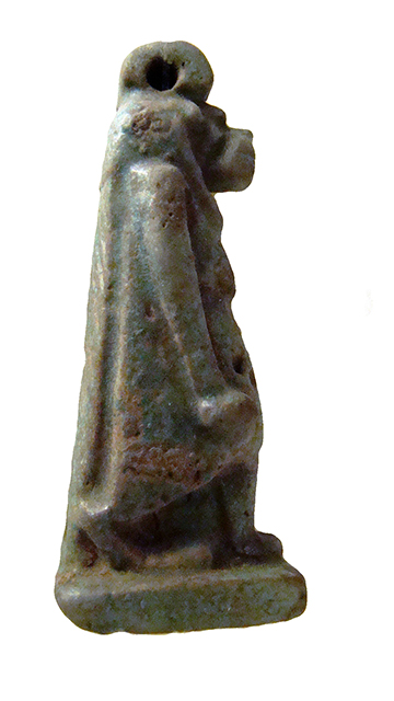 Amuleto in faience raffigurante la divinità apotropaica Toeris, patrona delle partorienti e dei neonati. La dea è raffigurata in piedi, con il muso di coccodrillo, una lunga parrucca, il corpo da ippopotamo gravido, con le braccia distese lungo il corpo. I piedi poggiano su una base parallelepipeda, mentre il dorso con la coda da coccodrillo si fonde con il pilastro dorsale. Sulla testa è presente un anello di sospensione.