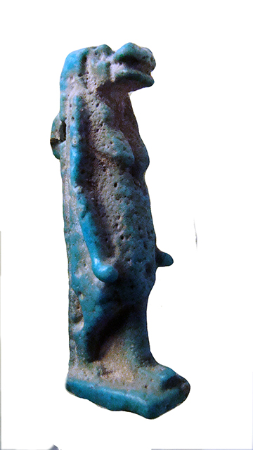 Amuleto in faience raffigurante la divinità apotropaica Toeris, patrona delle partorienti e dei neonati. La dea è raffigurata in piedi, con il muso di coccodrillo, una lunga parrucca, il corpo da ippopotamo gravido, con le braccia distese lungo il corpo. I piedi poggiano su una base parallelepipeda, mentre il dorso con la coda da coccodrillo si fonde con il pilastro dorsale, su cui è presente un anello di sospensione.
