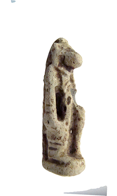 Amuleto in faience, privo dello strato lucido superficiale originale, che raffigura una dea stante, con i piedi che poggiano su una base e con pilastro dorsale. La dea ha testa di felino, per cui potrebbe essere la dea gatta Bastet o la dea leonessa Sekhmet.