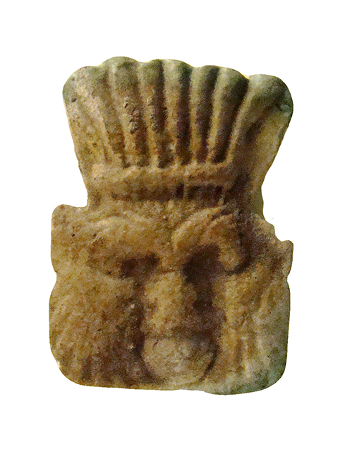 Piastrina in faience, con foro passante, con funzione di amuleto. Raffigura il volto della divinità apotropaica Bes, frontale con le orecchie sporgenti, le sopracciglia evidenziate, la barba e il grande naso piatto. Sul capo porta una corona di piume di struzzo. La faccia opposta è liscia.