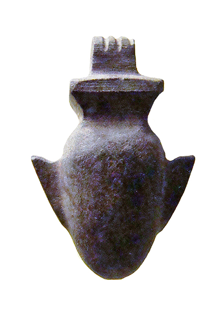Amuleto in pietra lavorato a tutto tondo, con presa non forata nella parte superiore. Raffigura il geroglifico "ib", vale a dire il "cuore", con la massa ovoide centrale e le terminazioni dei tre vasi sanguigni (due sui lati e una in alto); vista l'importanza di quest'organo nel giudizio dei defunti nell'aldilà, un tale amuleto veniva posto tra le bende delle mummie per evitare che il vero cuore venisse rapito.