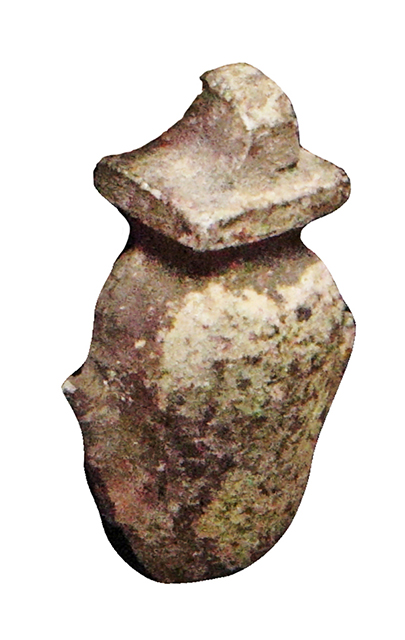Amuleto in pietra lavorato a tutto tondo, con presa non forata nella parte superiore. Raffigura il geroglifico "ib", vale a dire il "cuore", con la massa ovoide centrale e le terminazioni dei tre vasi sanguigni (due sui lati e una in alto); vista l'importanza di quest'organo nel giudizio dei defunti nell'aldilà, un tale amuleto veniva posto tra le bende delle mummie per evitare che il vero cuore venisse rapito.