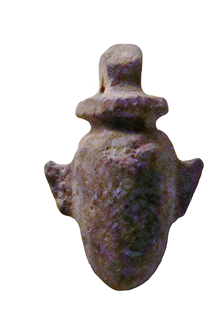 Amuleto in pietra lavorato a tutto tondo, con presa forata nella parte superiore. Raffigura il geroglifico "ib", vale a dire il "cuore", con la massa ovoide centrale e le terminazioni dei tre vasi sanguigni (due sui lati e una in alto); vista l'importanza di quest'organo nel giudizio dei defunti nell'aldilà, un tale amuleto veniva posto tra le bende delle mummie per evitare che il vero cuore venisse rapito.