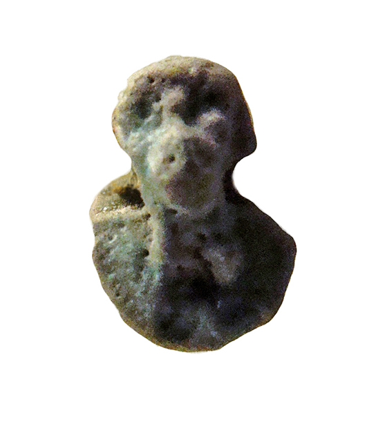 Amuleto in faience che raffigura il busto della dea Sekhmet, nella forma normalmente detta "egida" (a imitazione degli stendardi usati nei templi della dea): il volto leonino della dea è frontale, e l'amuleto è caratterizzato dall'ampio collare semicircolare. Sul capo vi è il consueto disco solare con ureo.