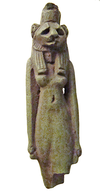 Amuleto frammentario in steatite che raffigura la dea Sekhmet. L’iconografia è quella consueta, di donna con testa di leonessa. La dea è raffigurata stante, con le braccia lungo il corpo. Sul capo sembra avere la doppia corona dell'Alto e Basso Egitto, molto stilizzata. L'amuleto è spezzato all'altezza delle ginocchia.