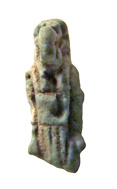 Amuleto in faience che raffigura il dio Thot, dio della sapienza e inventore dei geroglifici. In modo abbastanza schematico, il dio è raffigurato in piedi, nell'atto di camminare (ha la gamba sinistra in avanti); la testa è quella dell'ibis, suo animale sacro, caratterizzata dal lungo becco a forma di falce lunare (non particolarmente accentuato), con una parrucca che scende sul petto; le braccia sono stese lungo il corpo, con le mani chiuse a pugno; indossa un corto gonnellino pieghettato. L'amuleto è spezzato all'altezza delle ginocchia, ma sul retro si sviluppa il pilastro dorsale, in cui è ricavato il foro di sospensione.