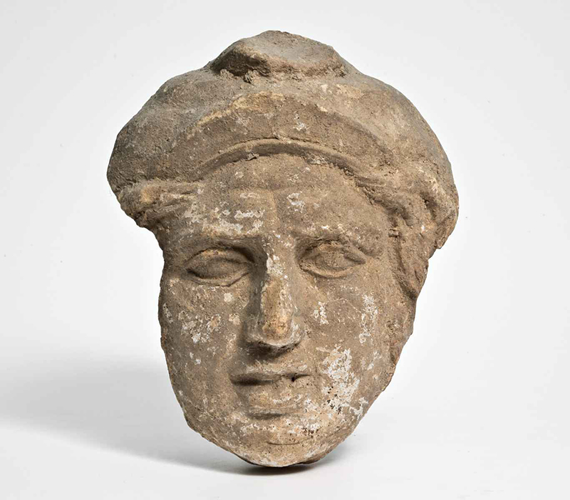 Argilla di color beige, coperta da uno strato marroncino dovuto ad incrostazioni; in frattura argilla rossastra. La figura presenta sulla fronte una specie di diadema; la testa è piuttosto massiccia, i capelli escono ai lati della fronte solcata da una ruga verticale; le palpebre sono rilevate, la bocca dischiusa, le labbra carnose. L'espressione patetica forse rappresenta un'Amazzone.