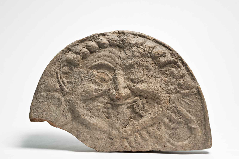 Argilla di color grigio chiaro; in frattura argilla di color arancione. E' rovinata in superficie ed è coperta di incrostazioni, di forma semiellittica. Dalla barba della gorgone spuntaun serpente per lato.