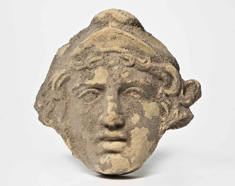 Argilla di color beige, coperta da uno strato marroncino. La figura presenta sulla fronte una specie di diadema; la testa è piuttosto massiccia, i capelli escono ai lati della fronte solcata da una ruga verticale; le palpebre sono ben marcate, l'occhio sinistro è volto leggermente verso il basso, la bocca dischiusa, le labbra carnose.