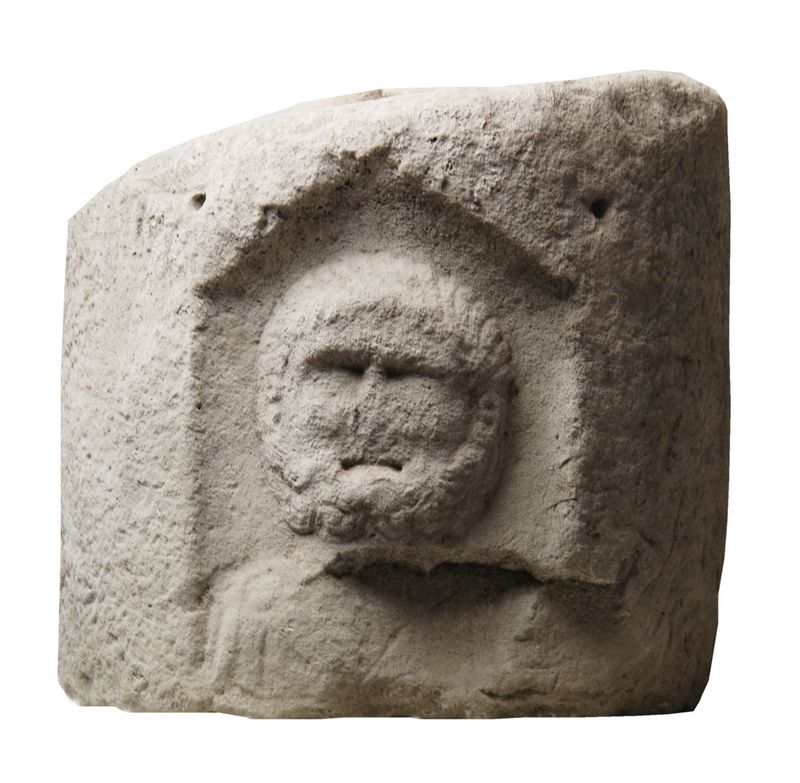 Il blocco, appena sbozzato, mostra un rilievo di esecuzione piuttosto grossolana raffigurante una testa barbuta riferibile probabilmente a Ercole.