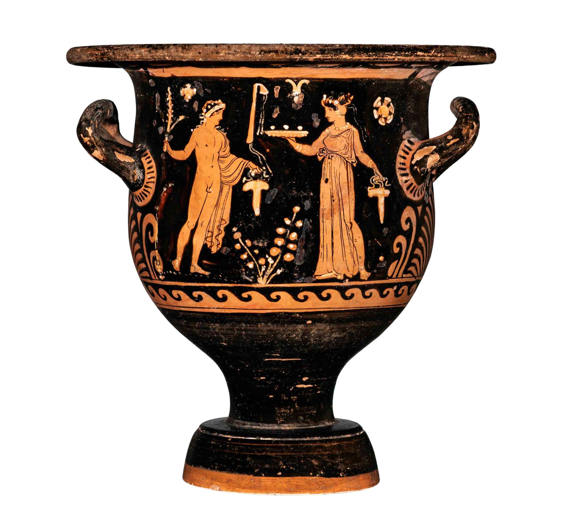 Cratere a campana apulo a figure rosse. Lato A: scena di offerta; Lato B: due giovani ammantati.