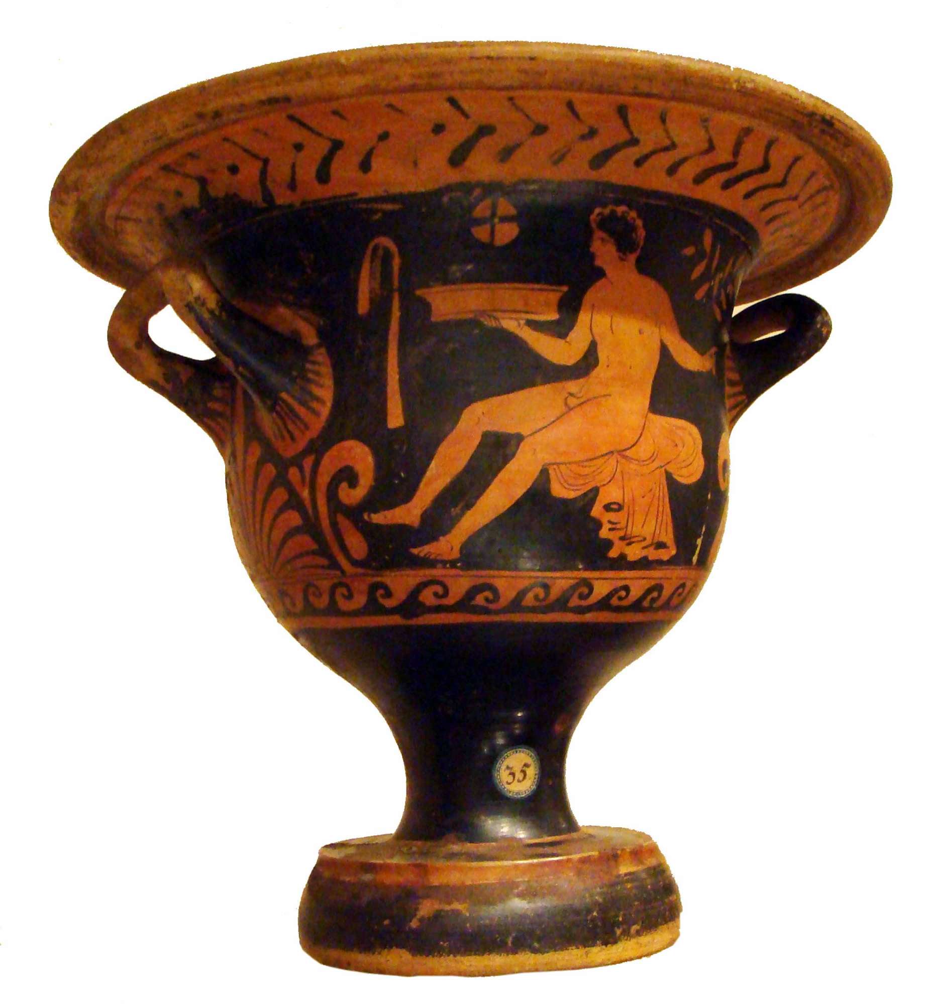 Cratere a campana apulo a figure rosse. Lato A: giovane nudo seduto con patera e tirso. Lato B: figura femminile seduta con flabellum e cofanetto.