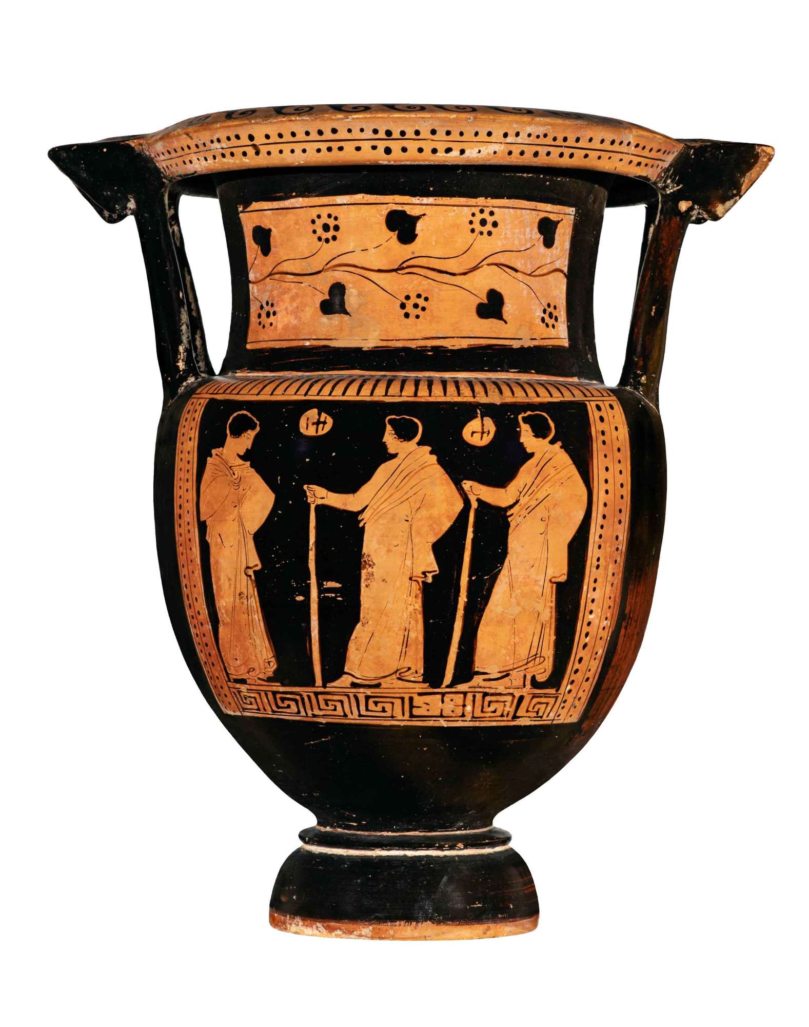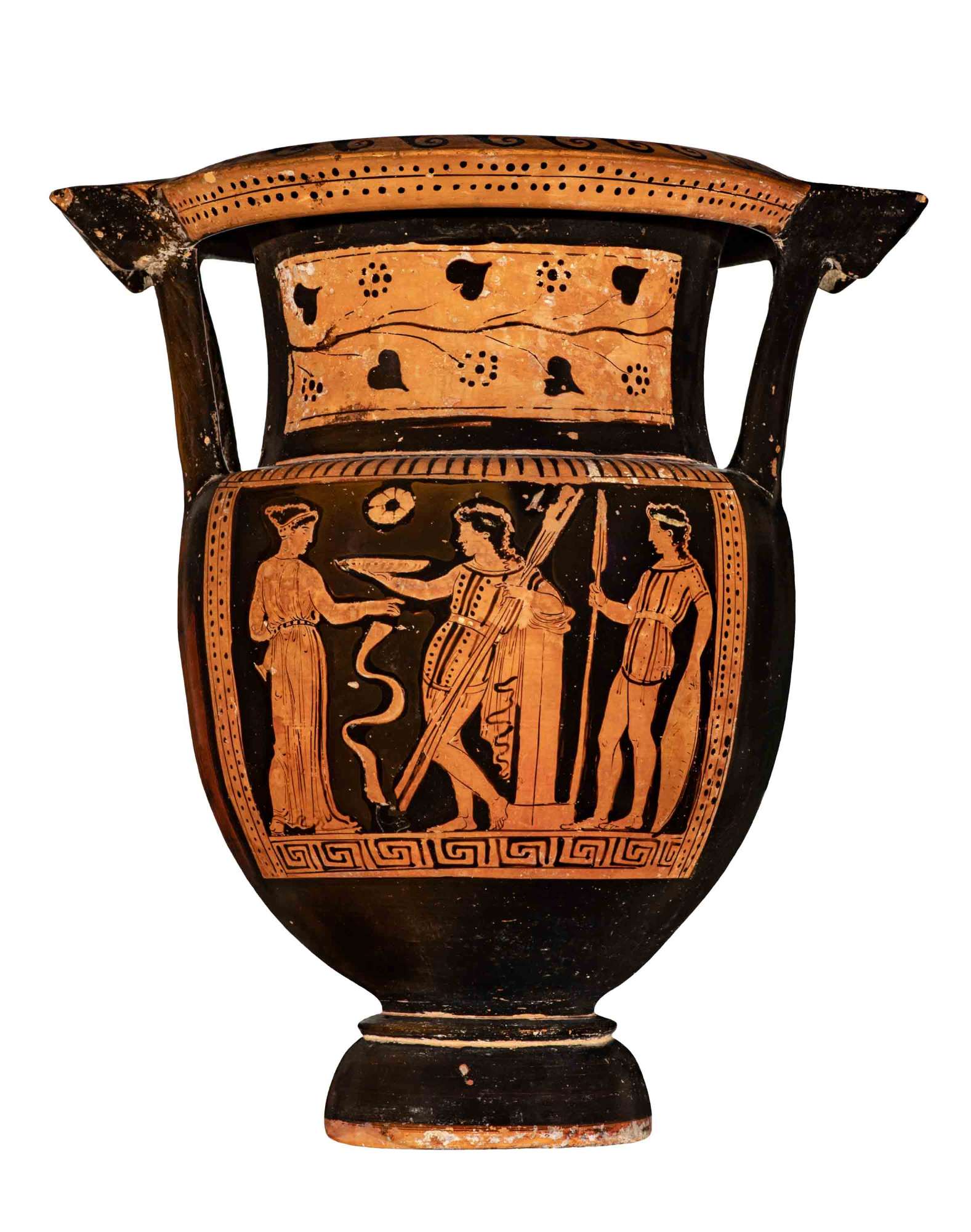 Cratere a colonnette apulo a figure rosse. Lato A: scena di offerta:giovane appoggiato a una colonna con due lance e una patera; figura femminile; altro giovane armato di lancia e scudo. Lato B: tre giovani ammantati con bastone.