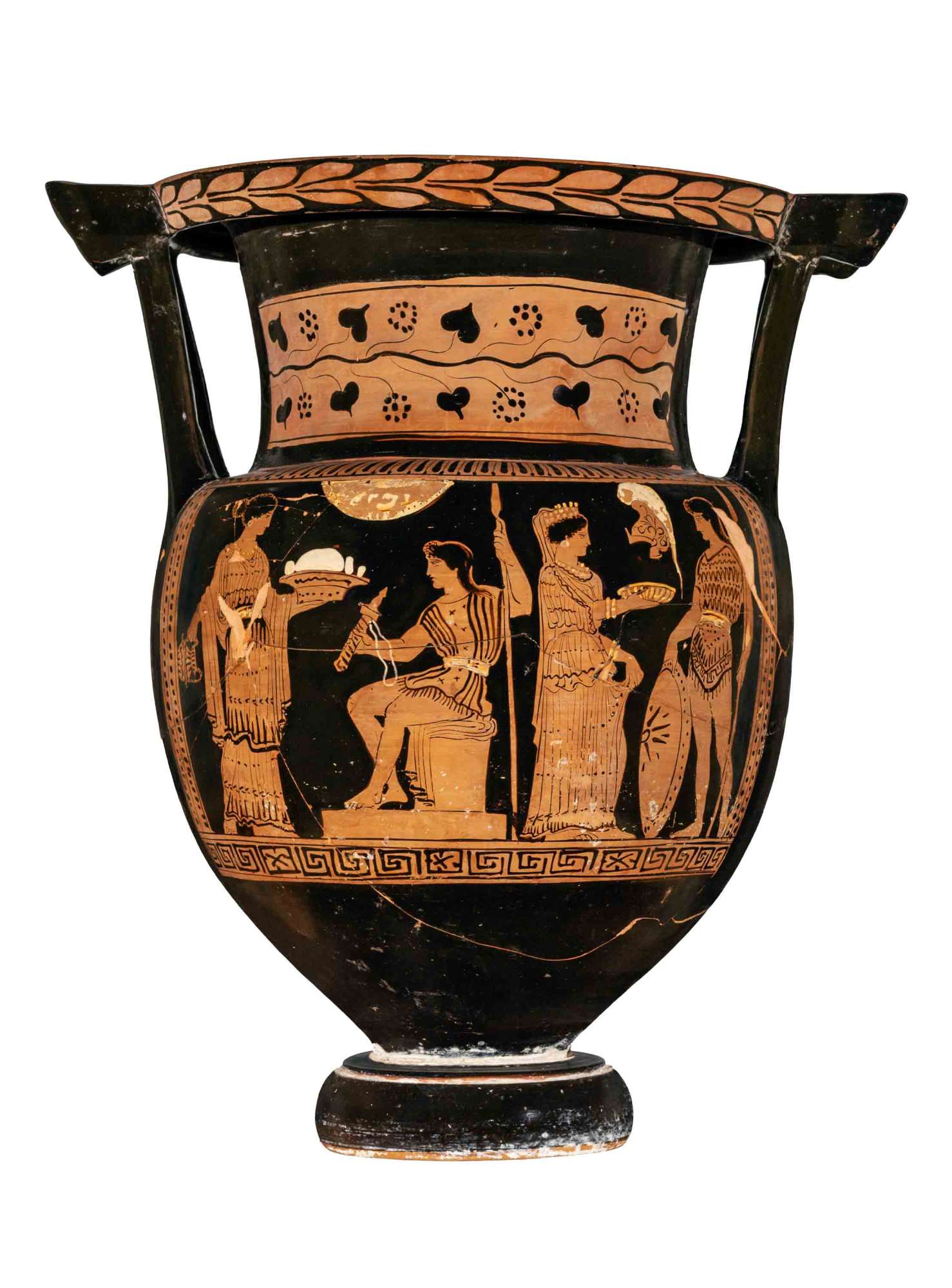 Cratere a colonnette apulo a figure rosse. Lato A: partenza di guerrieri, donna stante con offerte, guerriero seduto con spada e lancia, donna stante offerente, guerriero con scudo e lancia. Lato B: satiro tra due menadi con corno potorio.