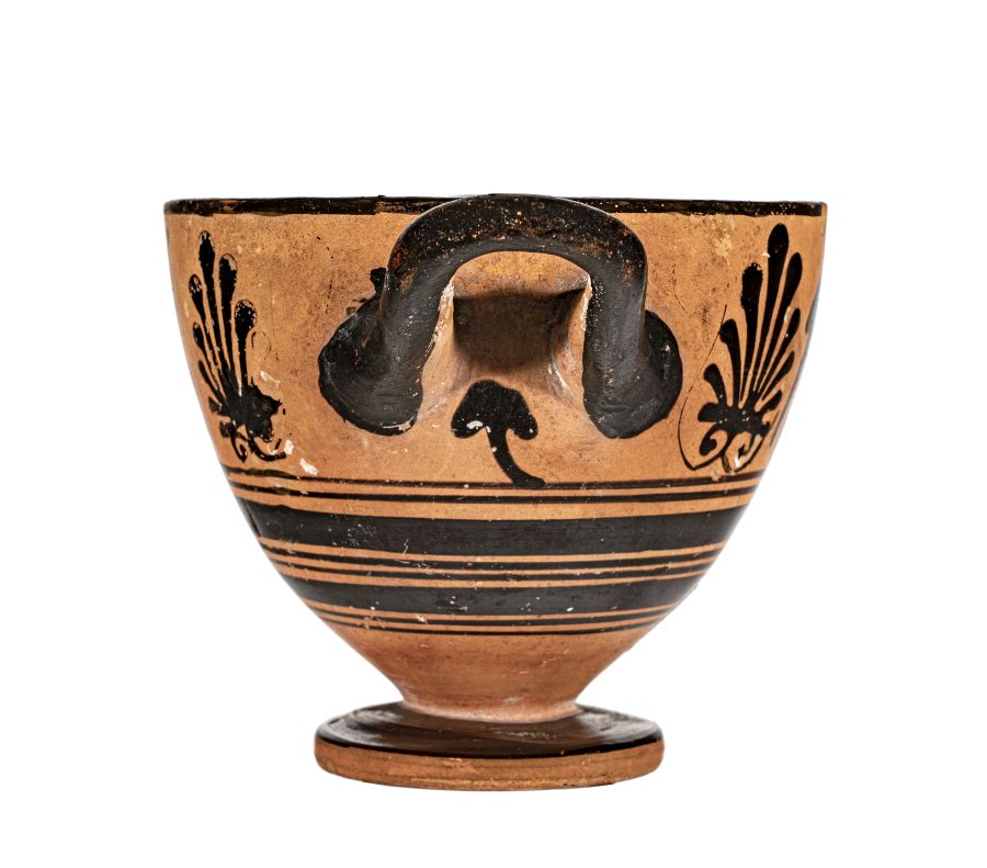 Cup-skyphos attica a figure nere. Lato A e B: tra due palmette allungate su volute, sta il dio Dioniso barbato con lungo chitone, seduto su diphros mentre regge un rhyton.