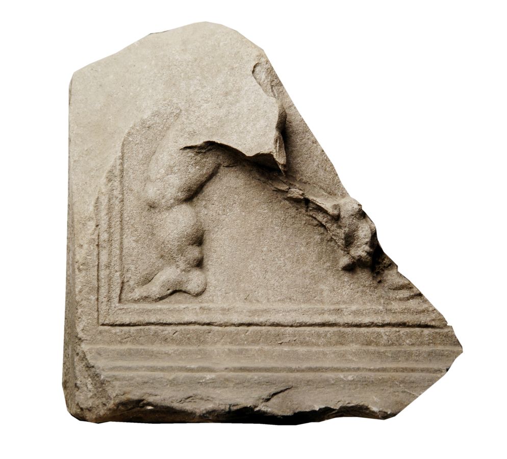 Frammento di rilievo di cui rimane la gamba e un piede di un erote probabilmente da una composizione con eroti simmetrici reggenti ghirlanda. Appartenne ad una balaustra e benché la provenienza non sia nota si propone di collegarlo ai rilievi con la testa di Giove Ammone e Medusa da un edificio pubblico nell'area capitolina di Trieste.