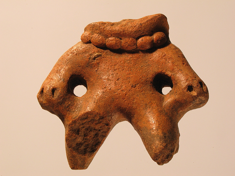 Figurina antropomorfa di stile Usulután modellata in argilla rossa e rivestita da un sottile strato di argilla mista ad acqua (ingobbiatura). Il corpo, a lavorazione piena, è visto frontalmente in posizione eretta. La testa si è spezzata all’altezza del collo. Gli arti sono corti e tozzi; le braccia separate dal busto sono distese e le mani sono unite ai fianchi. Le dita sono individuate da tre solchi. Le gambe, bifide, sono parzialmente. Intorno al collo è applicata una collana composta da una fila di perle ovali. La superficie è levigata.