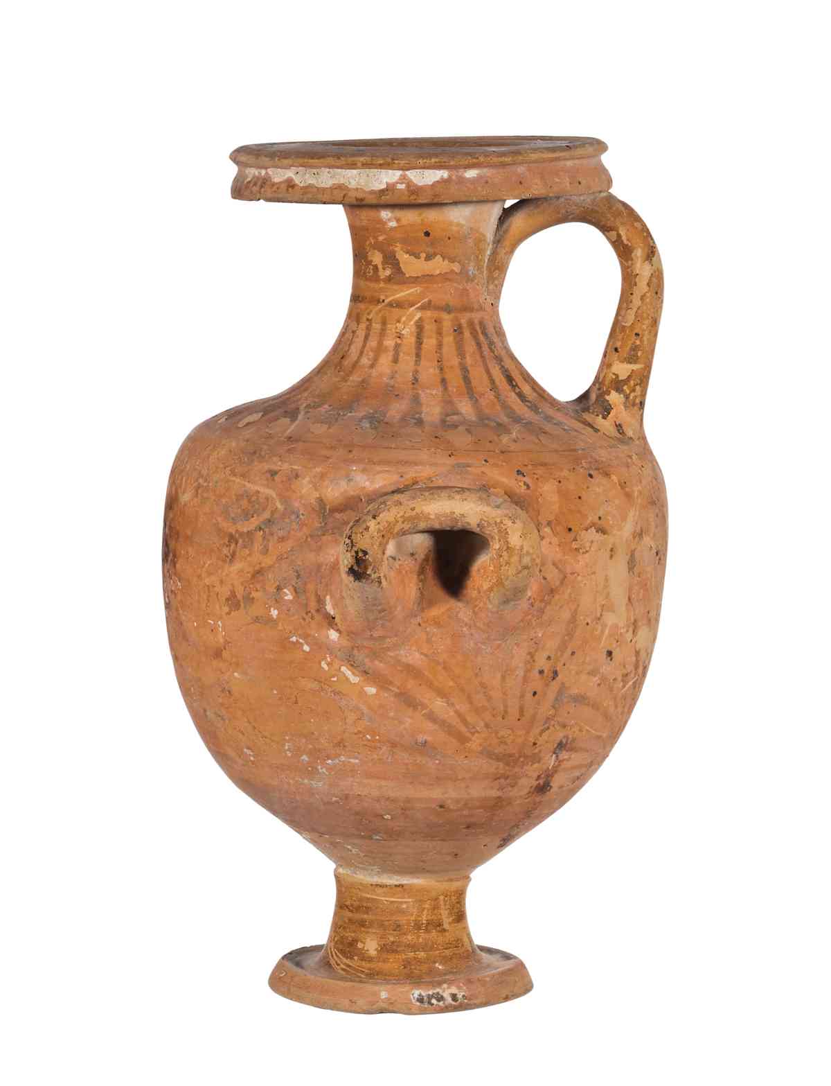 Argilla rosata (Munsell 7.5 YR), vernice totalmente abrasa, con le immagini sovraddipinte di difficile o impossibile lettura. Il vaso presenta una stretta imboccatura con orlo fortemente estroflesso distinto e labbro modanato; il corpo globulare, ma rastremato verso il fondo, poggia su un piede a disco dal profilo troncoconico con alto stelo. Il vaso presenta due anse a bastoncello, impostate orizzontalmente e tanto ripiegate da toccare il corpo del vaso. La terza ansa, sempre a bastoncello, è verticale e impostata tra orlo e spalla. Purtroppo la decorazione, vista la forte abrasione della vernice, appare quasi del tutto corrotta e difficilmente decifrabile. Si può notare tuttavia un elemento della decorazione accessoria, costituito da una fascia decorata a baccellatura nello spazio compreso tra collo e spalla. Dal momento che la forma non trova confronti con la ceramica lucana, resta dubbio l'inserimento di questo vaso in tale categoria. Sul vaso sono presenti diverse etichette: una sul piede, con indicazione del numero '74'; in prossimità della scritta 'dono Picotti | 3 12 1943 | 2288'. L'etichetta sembra posta su un'etichetta precedente, non più leggibile. Dall'altra parte dell'anello del piede si nota la scritta 'Arezzo', che compare anche su una seconda etichetta apposta presso l'ansa orizzontale destra, immediatamente sotto la spalla, forse ad indicare il luogo di acquisto o provenienza del reperto. Vi è infine una terza etichetta sull'orlo del vaso, sulla quale si legge la scritta '109'.