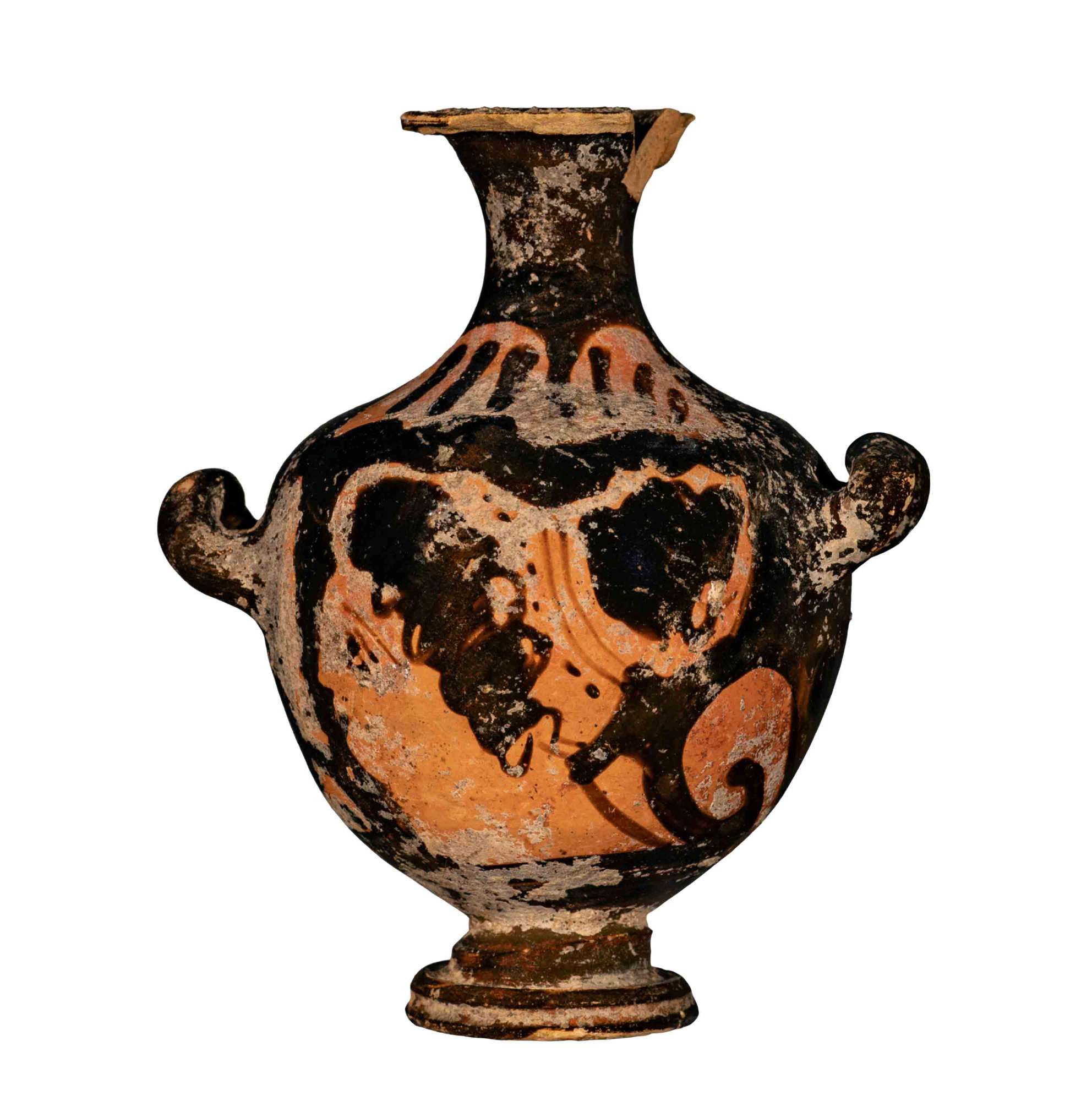 Hydria miniaturistica apula a figure rosse con testa femminile