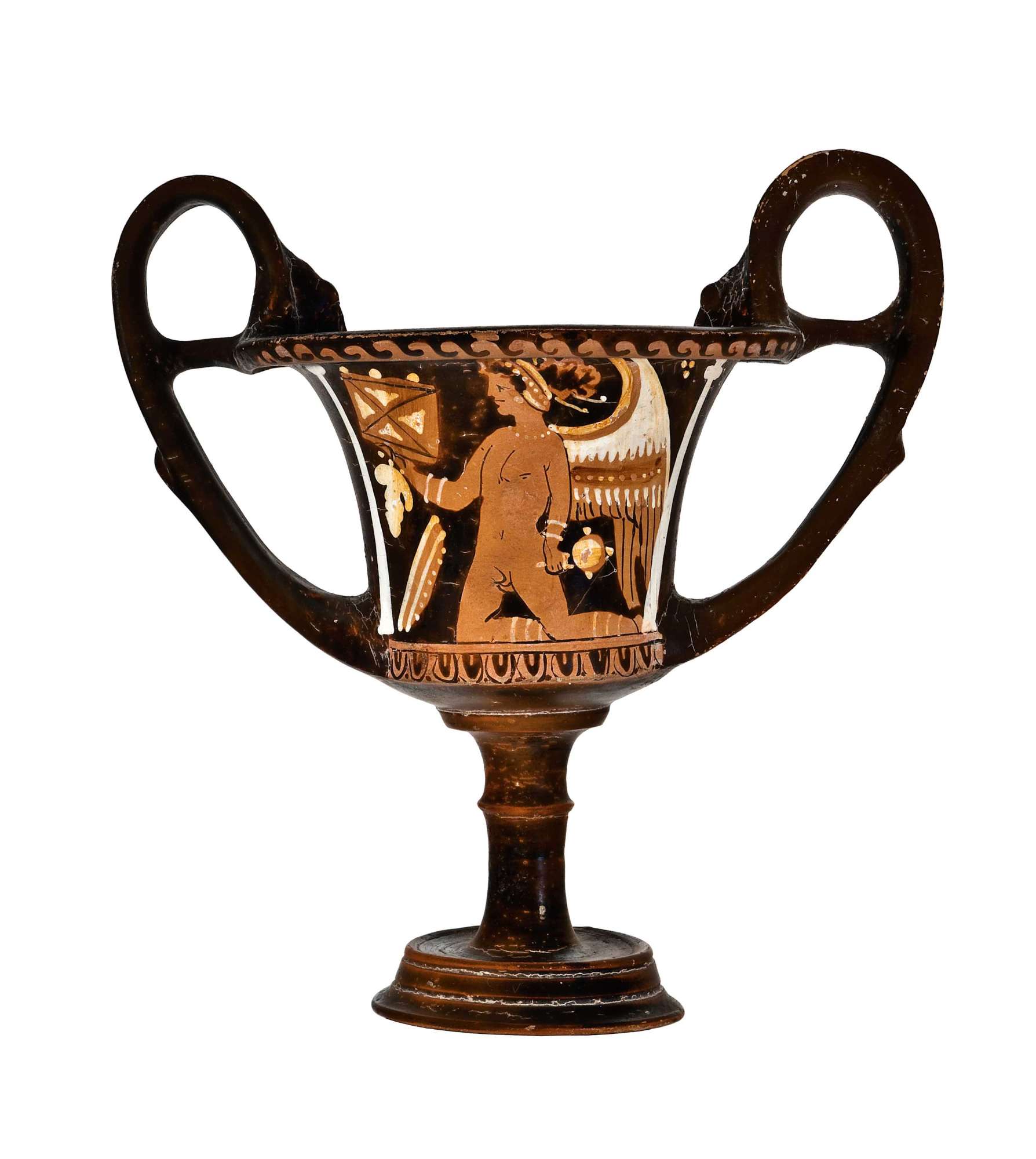 Kantharos apulo a figure rosse con elementi bianchi. Lato A: Eros nudo alato inginocchiato con kalathos, grappolo patera e specchio. Lato B: Eros simile con grappolo e specchio.