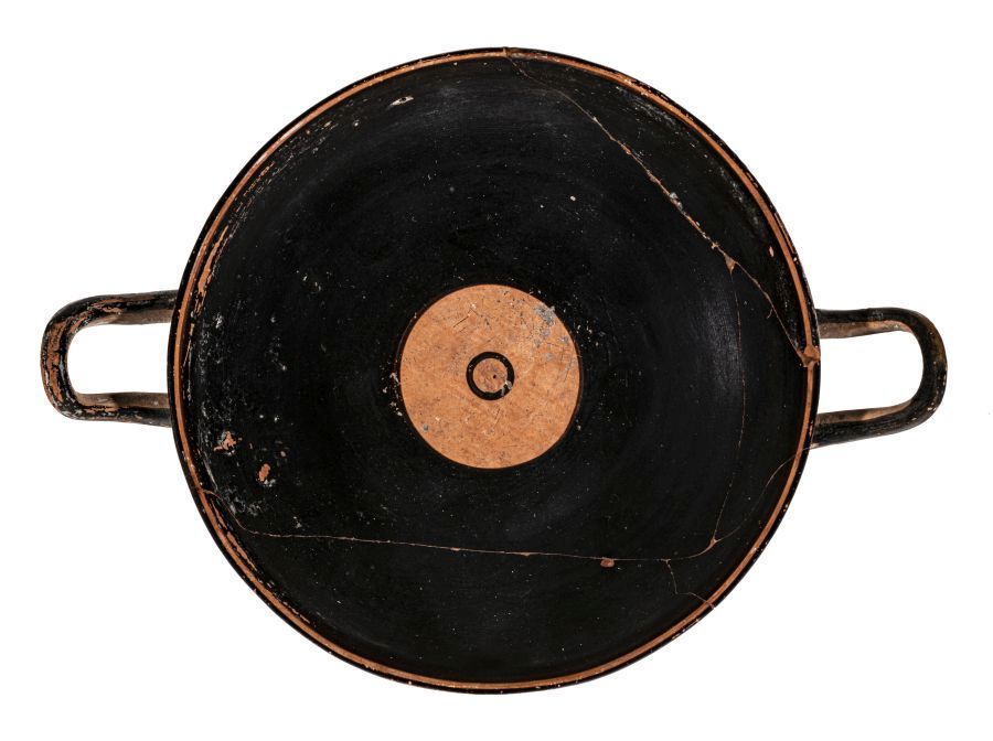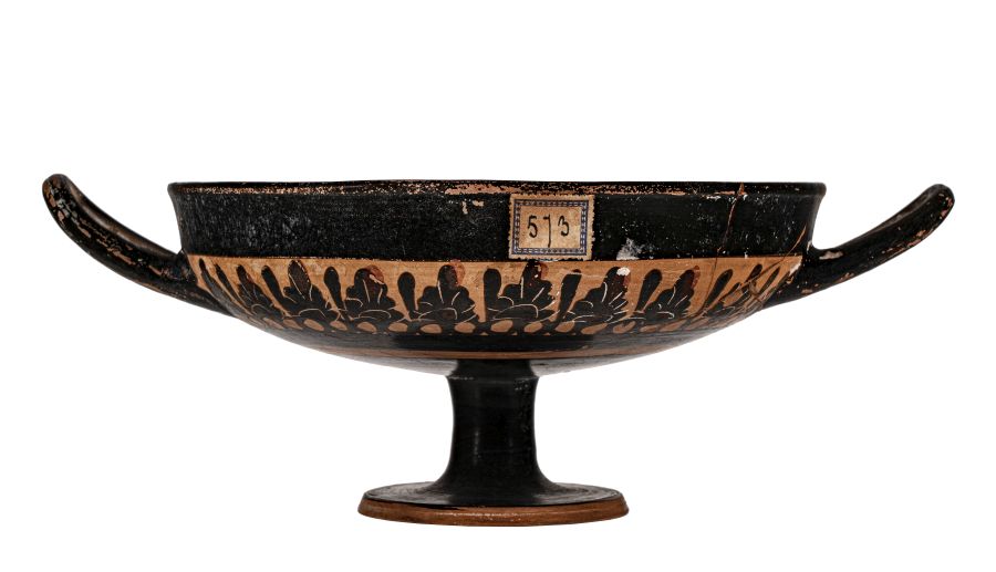 Kylix su basso piede attica a figure nere con tracce di colore rosse. Fascia di palmette.