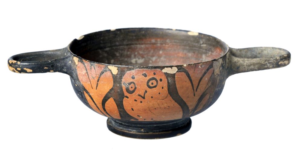 Kykux Skyphoide apula a figure rosse con anse a nastro orizzontali. Lato A e B: civetta tra foglie lanceolate.