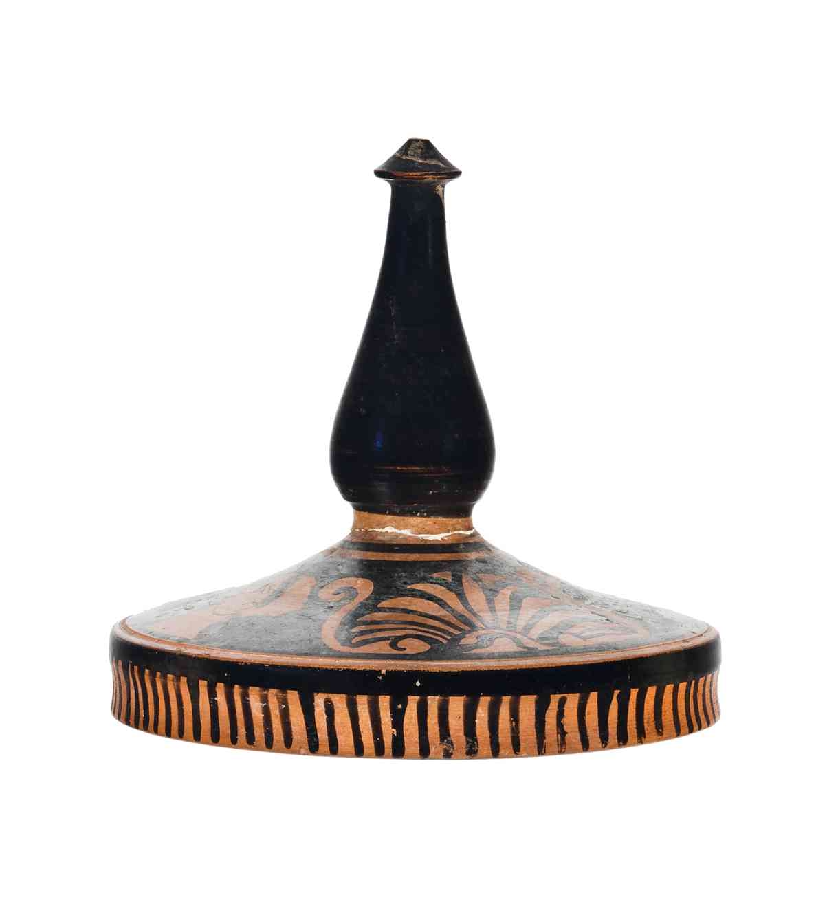 Buono; Interamente ricomposto da due frammenti originari, di cui uno è il manico e l'altro il coperchio vero e proprio. Si evidenziano, sul bottone conico della presa, una piccola crepa e una minima scalfittura.