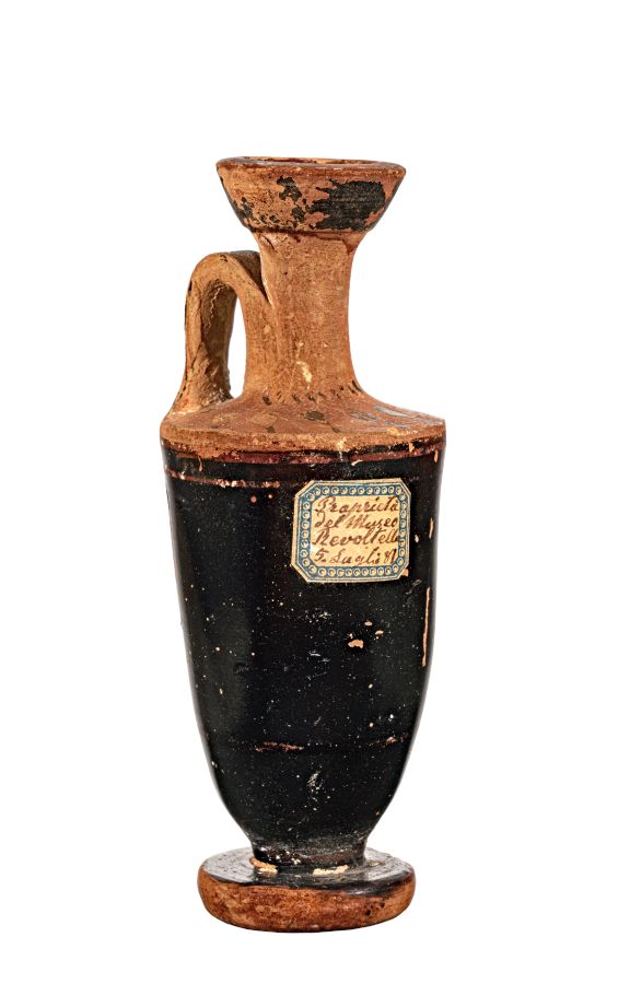 Lekytos attica a figure nere con motivo a raggiera e a boccioli di loto stilizzati sul collo.