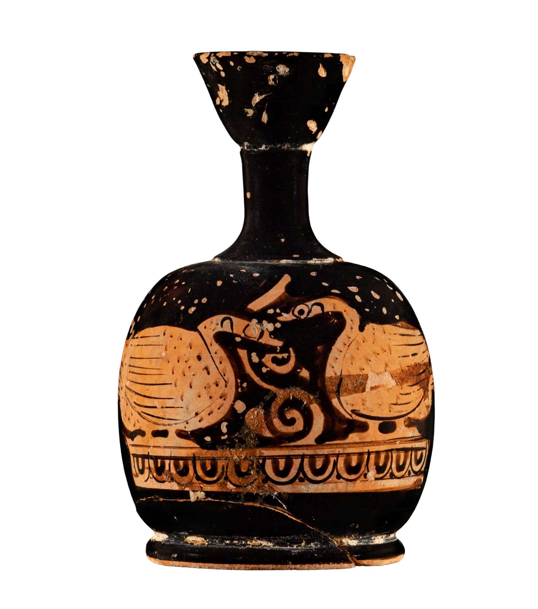 Lekythos aryballica a figure rosse. Largo bocchello svasato con labbro arrotondato e distinto dal collo da un sottile cavetto, collo affusolato. Lato A: coppia di cigni affrontati La scena è occupata da una coppia di cigni affrontati divisi da un elemento vegetale con estremità a spirale; gli occhi, resi frontalmente, sono costituiti da un puntino circoscritto da una sottile circonferenza a vernice nera; il piumaggio è realizzato con tratti a vernice nera diluita nella parte anteriore e presso la coda; le ali, invece, sono caratterizzate da una serie di sottili linee continue a vernice nera.