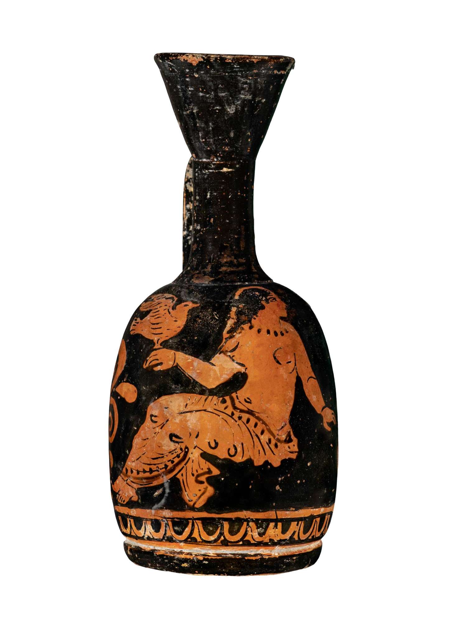 Largo bocchello svasato con labbro arrotondato e distinto dal collo da una sottile modanatura. Lato A: figura femminile seduta con colomba Figura femminile seduta di tre quarti verso sinistra, retrospiciente; fronte e naso costituiti da un’unica linea continua; occhio con dettaglio di sopracciglio arcuato, rima superiore e inferiore coincidenti e pupilla in nero. I lunghi capelli, a vernice nera, ricadono sciolti sulle spalle; al collo, unico ornamento, collana con unica fila di tratti a vernice nera. Il seno e tutta la parte superiore del busto fino alla zona pubica, caratterizzata dall’ombelico e da una sottile linea ricurva, rimangono scoperti dall’himation, lungo fino ai piedi e bordato da corona di tratti a vernice nera. Tiene la s.inistradietro la schiena in appoggio; la destra appena sollevata, sorregge una colomba di profilo in procinto di spiccare il volo.